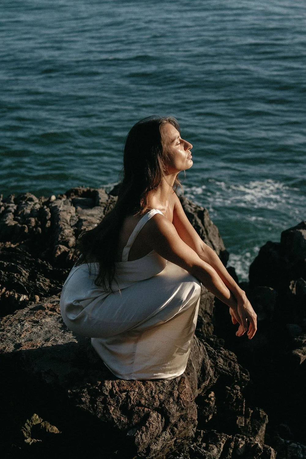 Bare shoulders. Breezy silks. Seafoam tones and slow glam.